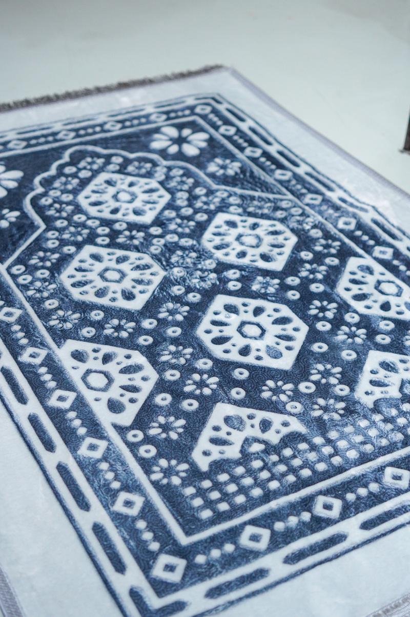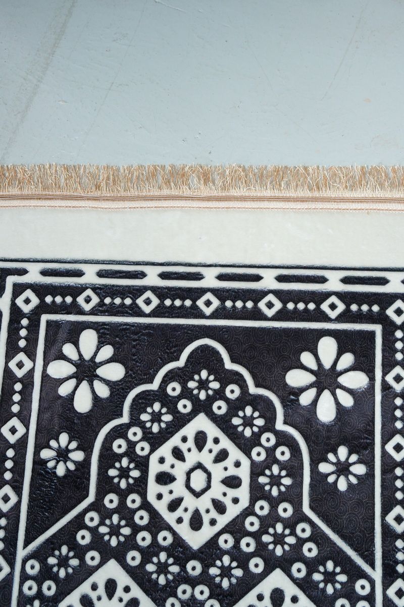 ลวดลายเป็นแนว เรขาคณิตและดอกไม้ในกรอบทรงโค้งแบบมัสยิด ซึ่งเป็นดีไซน์ที่นิยมมากในพรมละหมาดสำหรับมุสลิม